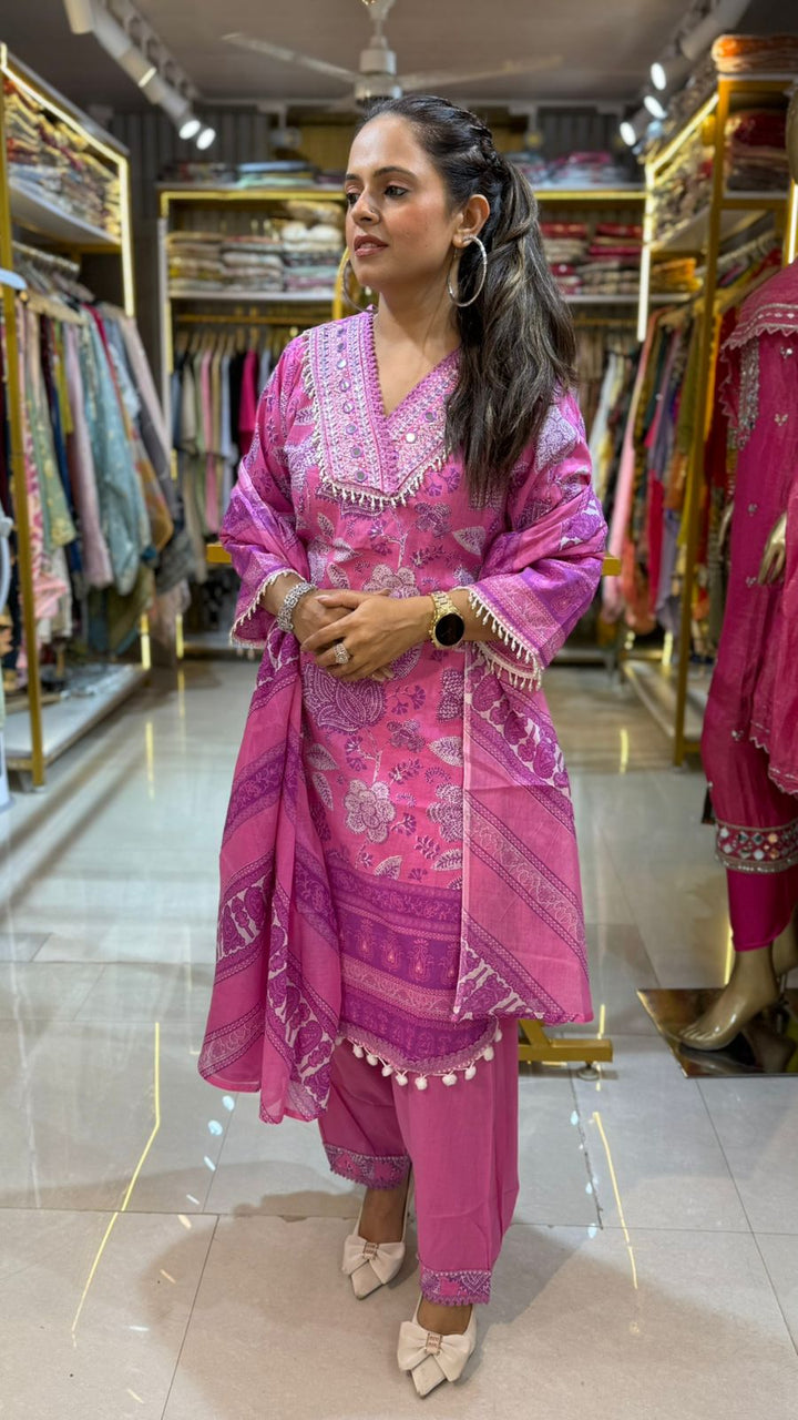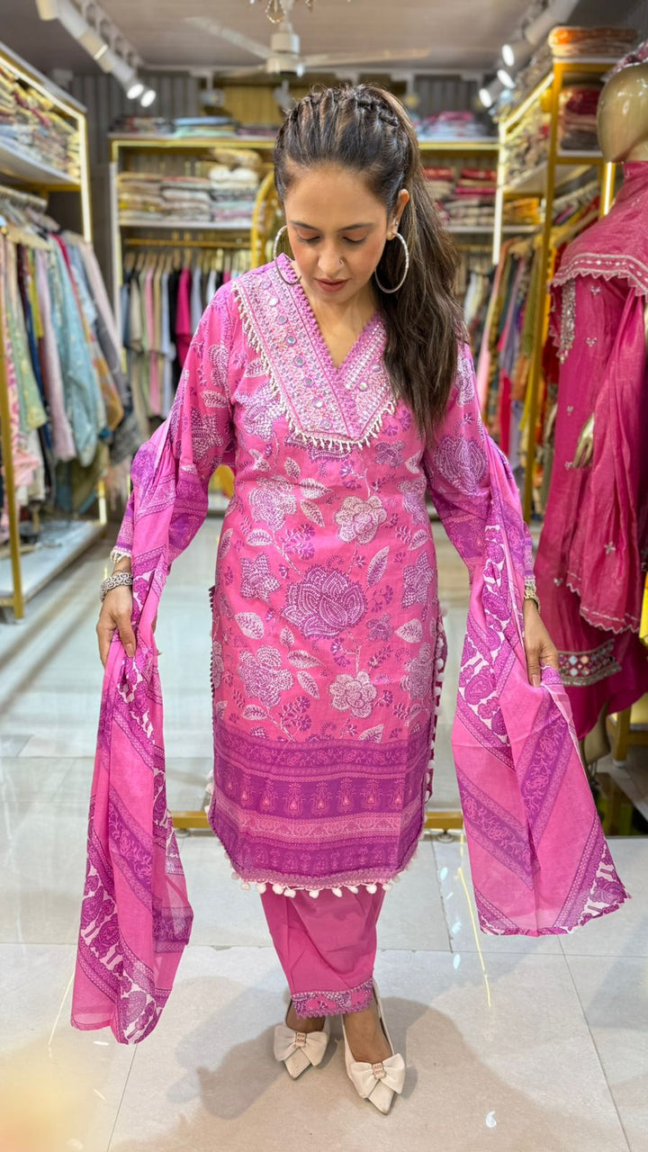 Crafted entirely from pure cotton, this ensemble offers exceptional comfort and breathability, making it ideal for all-day wear. The stitched pattern adds subtle elegance, while the matching pure cotton bottom ensures a cohesive look and easy maintenance. Completing the set, the pure cotton dupatta enhances versatility and comfort. Available in sizes M to XXL, it caters to a range of body types with expert attention to fit and fabric quality.